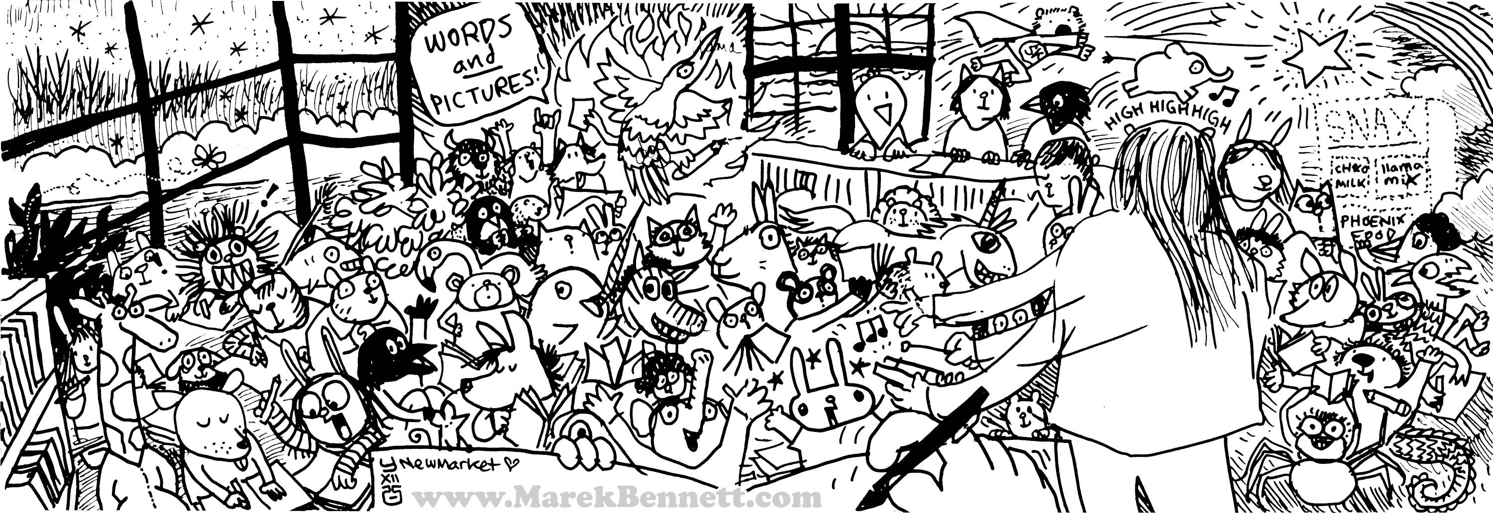 βοΈABOVE: Sketchbook page drawn during a recent school visit ~~ Featuring input from grades K-6, over 5 hours of library presentations to every class in the school!